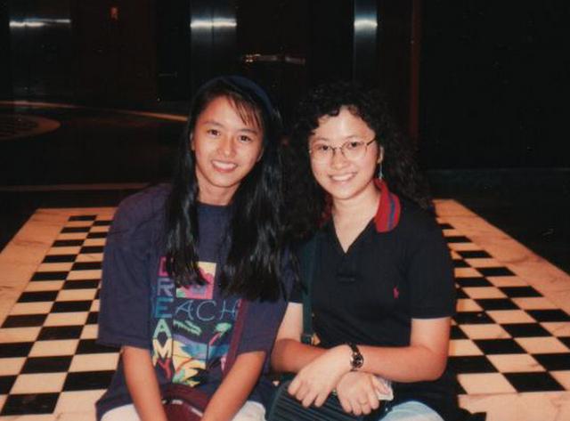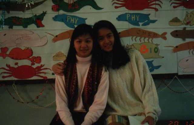 这张照片里的梁咏琪,额头前留着少许刘海,头发乌黑发亮。同样穿着一件大大的T恤,由于灯光较暗,梁咏琪的肤色看起来偏黑。青春时期的梁咏琪,脸上似乎永远洋溢着开心的笑容。