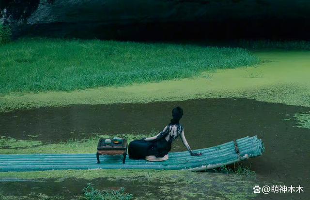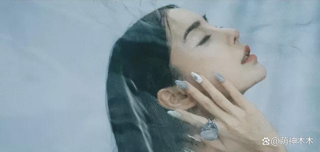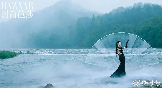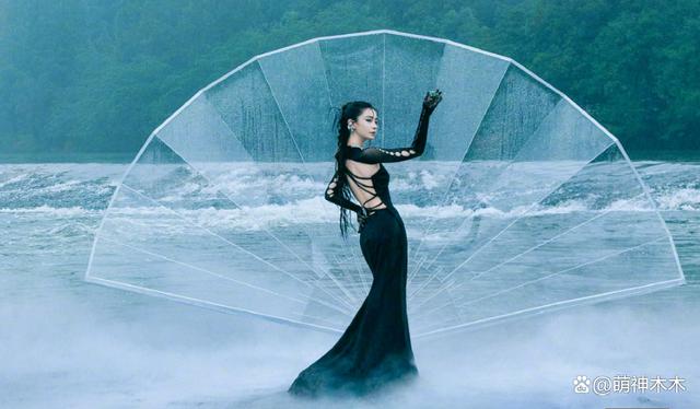 穿着背部镂空的黑色礼服站在水上摆造型的动作也一言难尽,场景设计还搭了一把透明扇子,让人成为扇子的轴心,只能说有想法,但是并不是国风,白白浪费了山水意境。杨颖在水面上摆了一个类似孔雀舞的动作,肢体就非常不自然,很生硬。