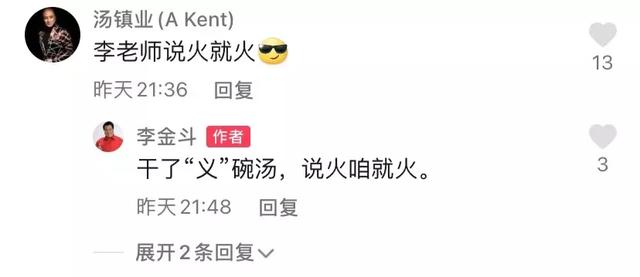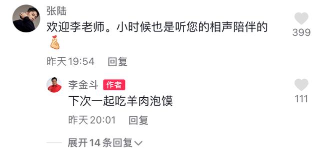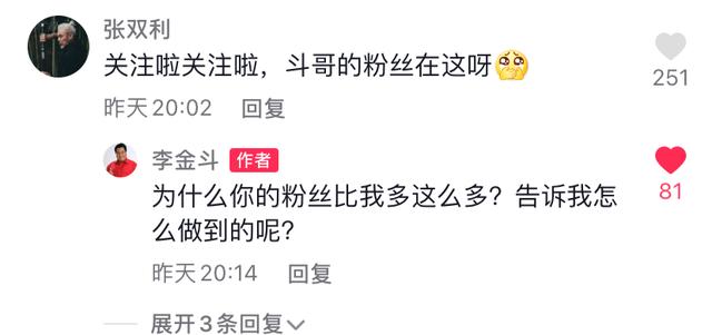 另外,作为相声圈内的长者,按理说李金斗应该积累起不少的人脉关系,但在他的评论区内仅有三位好友留言支持,一位是青年演员张陆,一位是老戏骨张双利,李金斗还搞笑地向他请教如何涨粉。最后一位是香港演员汤镇业,李金斗的回复也很有深意,他表示:干了“义”碗汤。这句足以证明两人之间的关系如同兄弟结义,另一面疑似暗示世态炎凉,人心向背。