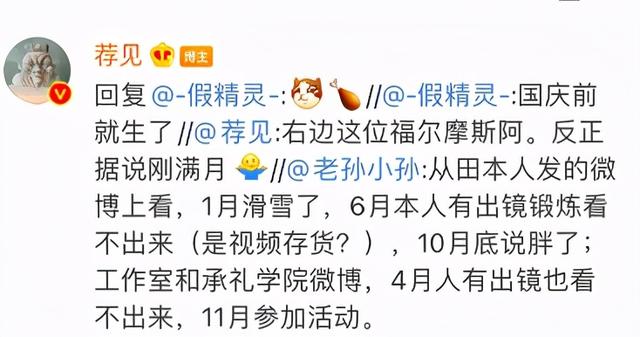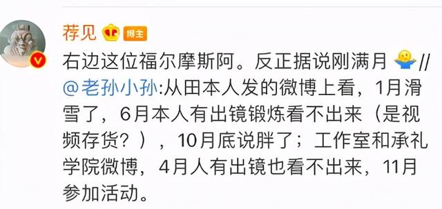 比如就有一位叫老孙小孙的网友,就翻完了田朴珺近半年的社交账号,还做了一个总结,称“从田本人发的动态上看,1月滑雪了,6月本人有出镜锻炼看不出来(是视频存货?),10月底说胖了;4月人有出镜也看不出来,11月参加活动。”