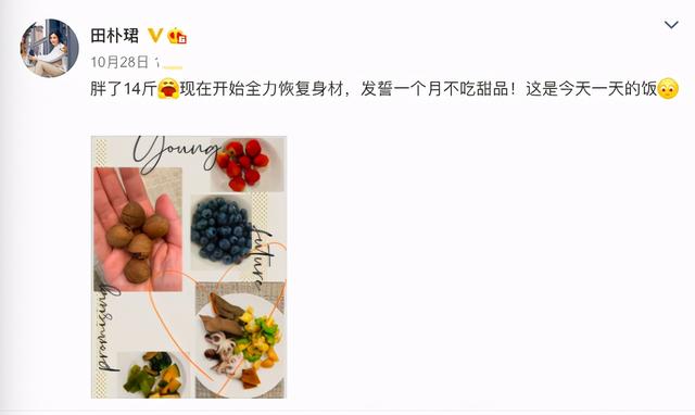10月28日的时候,田朴珺也的确发博称自己胖了整整14斤,还大呼要全力恢复身材。