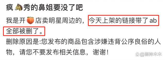 在风波发展的过程中,不少关于她受影响的爆料频出,包括《奔跑吧》特别季缺席录制,参演节目暂停播出等,还有网友发现自家店铺新上架的带 baby 的周边被平台删除了,理由是 " 发布的商品包含涉嫌违背公序良俗的人物,请您不要发布相关信息 "。种种情况似乎都在说明,杨颖风波影响还是有的。