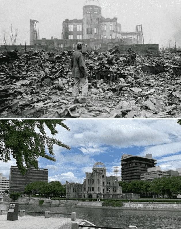 (39)日本广岛曾被投射原子弹,周围一切瞬间化为虚无,仅剩一座圆顶建筑没有倒塌。
