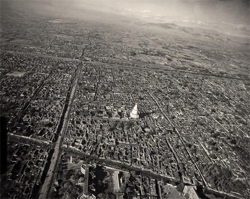 (06)1945年,美军拍摄的阜成门地区鸟瞰图。信息量非常大。从下往上:伍连德1918年创建的北京中央医院~~现在的北京大学人民医院白塔寺院区。白塔寺。阜成门。阜成门外大街两侧的整齐排房~~清朝的八旗营房。玉渊潭……