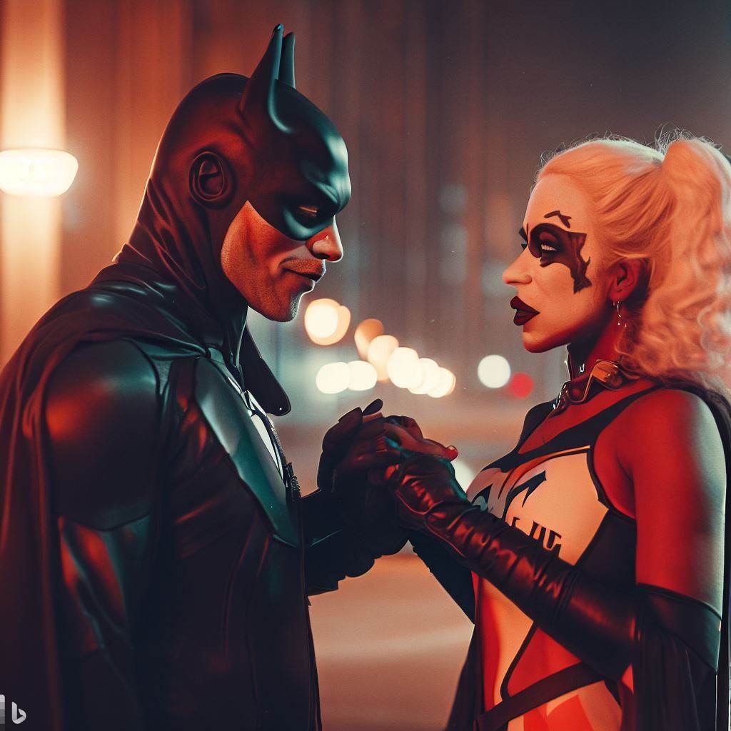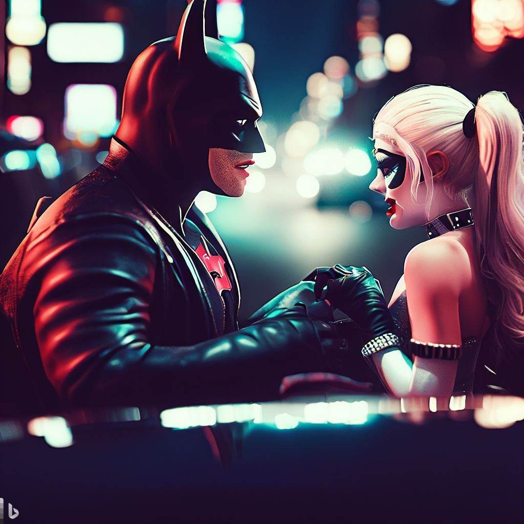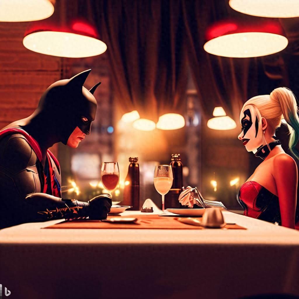 蝙蝠侠和小丑女在一家高档餐厅坐下,点了一些菜。他们都穿着普通的衣服,没有戴面具,也没有带武器。他们想尝试一下正常的生活,看看是否能够相爱。