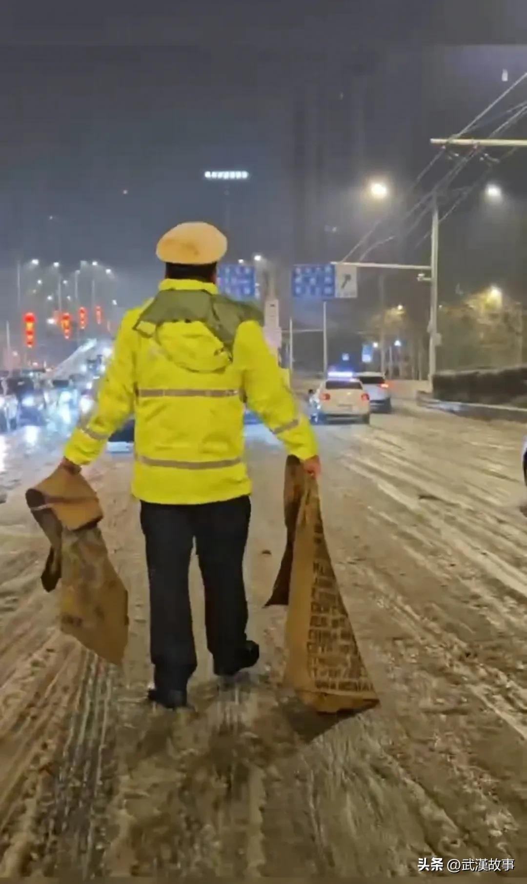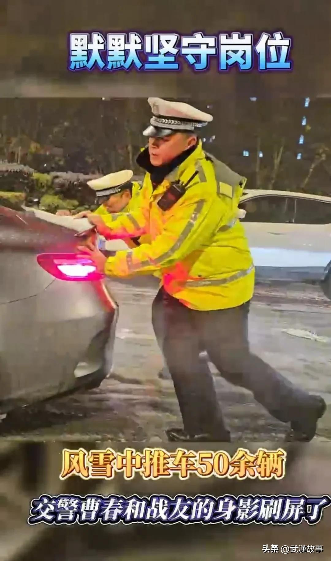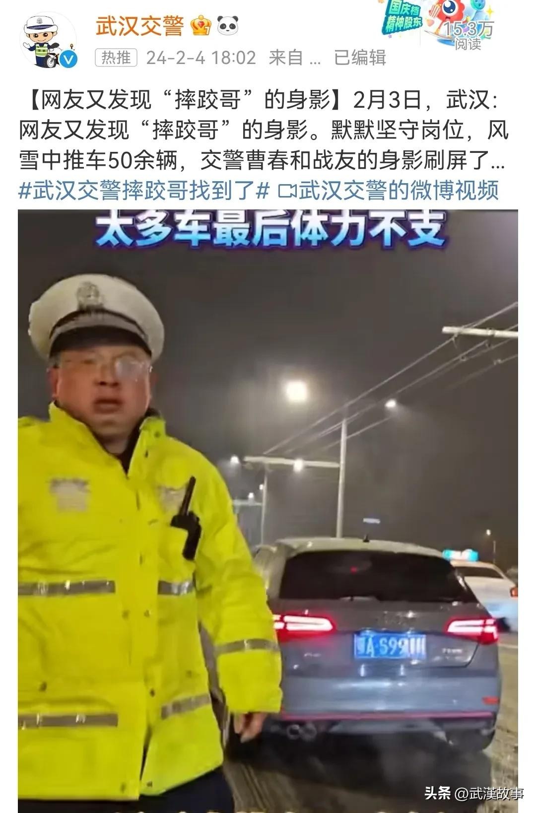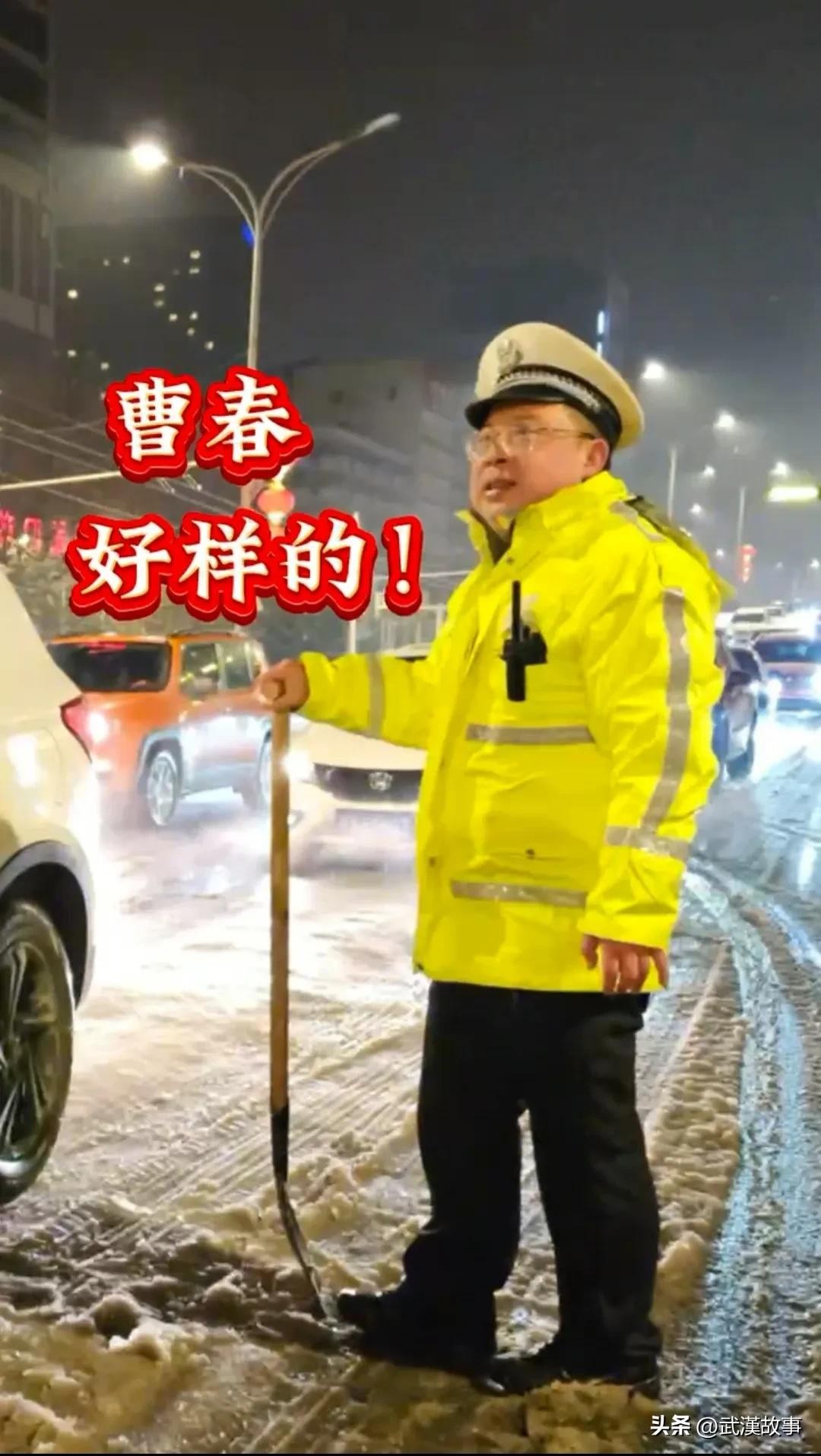 2月3日,网友在武汉街头再次捕捉到了"摔跤哥"的身影。他默默坚守岗位,顶着风雪推车50余辆,交警曹春和战友的身影在屏幕上定格,让人们为之动容。这个场景并不是偶然,曹春的坚守岗位、铁血精神已经成为他日常工作的常态。