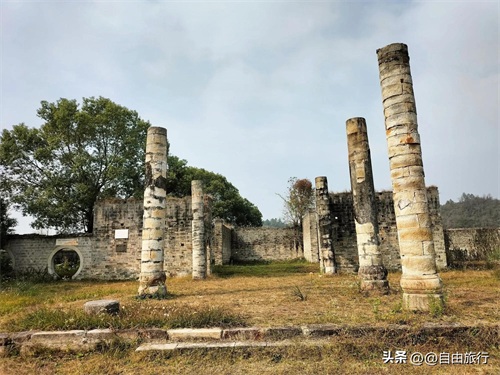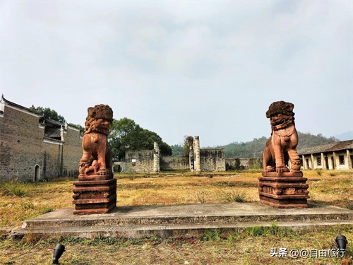 敦睦堂的几根高大石柱仍立于遗址之中。两座红石雕成的石狮,侧首相向,雄风犹在!
