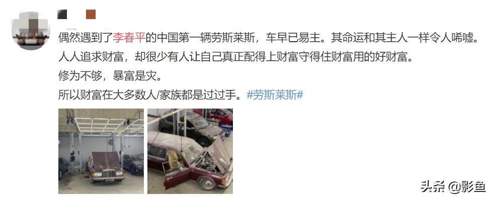 而30多年前意气风发地站在劳斯莱斯面前的那张照片,现状是近日有网友爆料车已易主且破败不堪,宛如原主人的命运遭遇。