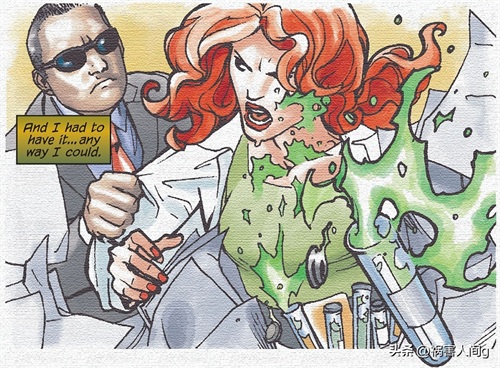 愤怒的帕梅拉冲破了安保人员的阻止,回到了实验室继续自己的研究,在安保人员阻止她时,她的研究药物“植物血清”溅满了她的全身。