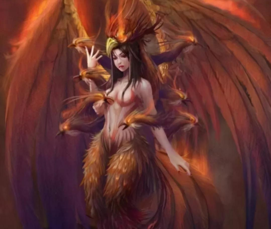 人面鸟身,耳挂青蛇,手拿红蛇,十二祖巫之一电之祖巫翕兹。