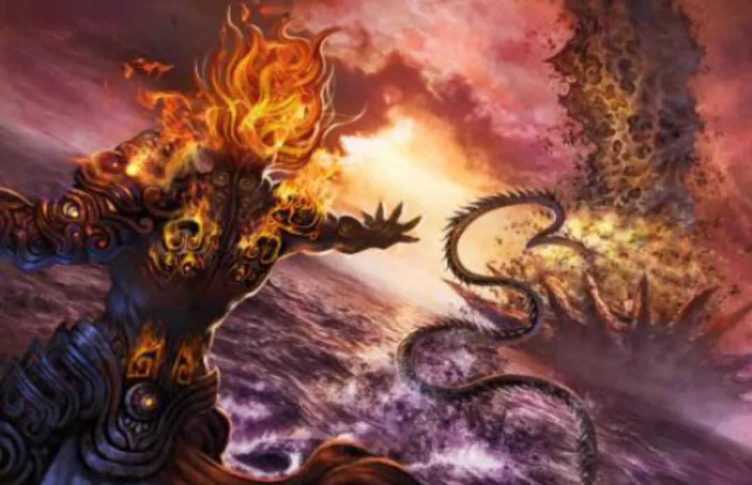 兽头人身,身披红鳞,耳穿火蛇,脚踏火龙十二祖巫之一的火之祖巫祝融。