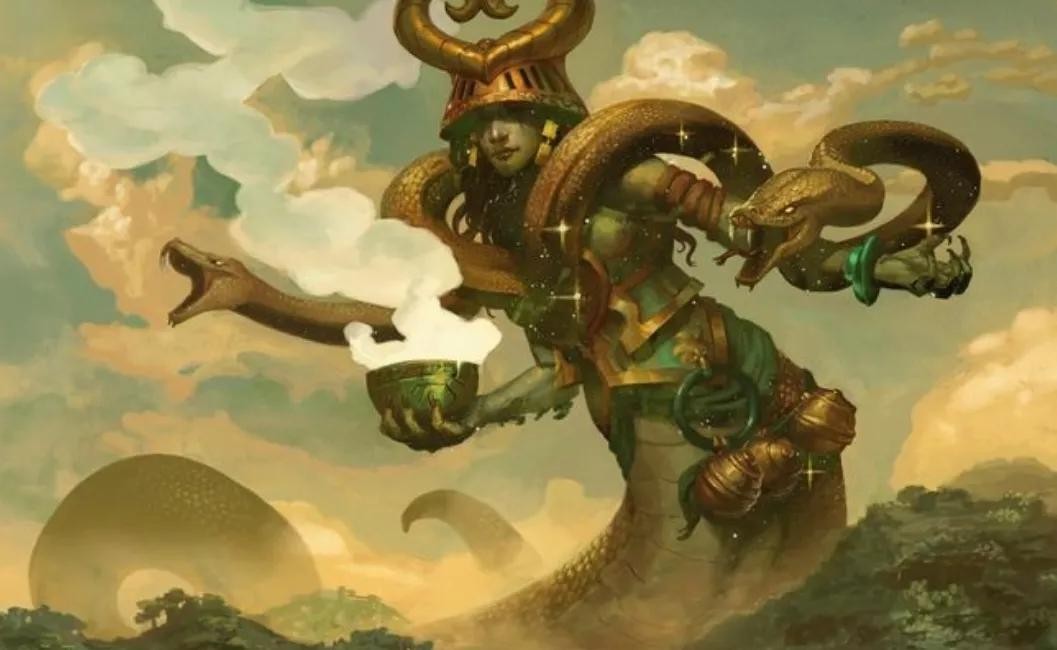 人身蛇尾,背后七手,胸前双手,双手握腾蛇,十二祖巫土之祖巫后土。
