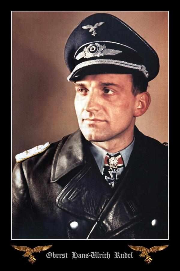 汉斯·鲁德尔出生于西利西亚,1936年时志愿加入德国空军,在第二次世界大战爆发时,鲁德尔还在侦查单位进行飞行训练,后在其意愿下转进俯冲轰炸机单位,并转调至法国。1941年6月,德国展开“巴巴洛萨作战”入侵苏联时,鲁德尔才执行了第一次俯冲轰炸机战斗任务。1941年9月23日,他投弹重创苏军战舰“马拉号”,使其被迫退出战列好几个月。1942年1月6日,鲁德尔在完成他第400次出击任务后,获颁骑士铁十字勋章,后转调至雷希林的空军试验场,测试装备BK 37反战车炮的Ju 87 G型的性能。鲁德尔之后驾驶Ju 87G型返回战场,于库班桥头堡一带作战,摧毁了大量登陆艇。1943年4月14日,鲁德尔因完成超过1000次战斗飞行任务而获颁橡叶骑士铁十字勋章;1943年10月30日,他摧毁了第100辆战车;11月25日,因完成了1600次飞行任务又使其铁十字勋章加上了“宝剑”;1944年2月22日,鲁德尔被任命为第2对地攻击“英麦曼”联队第3大队长。1944年3月29日,鲁德尔因摧毁了超过200辆战车,并出击了超过1,800次战斗任务,令其铁十字勋章被加封“钻石”级,即“钻石橡叶佩剑骑士铁十字勋章”。1944年10月,鲁德尔任第2对地攻击联队队长。1944年12月22日,鲁德尔完成了第2400次的战斗任务,并在隔天摧毁了其生涯的第463辆战车,因此于1945年1月1日由阿道夫·希特勒亲自赠与“钻石金橡叶佩剑骑士铁十字勋章”。1945年2月8日,鲁德尔在任务中身负重伤,右脚小腿被截肢,并需长时间静养,但他又在3月25日升空出击,最终于5月8日在基特辛根陆军机场向美军投降。