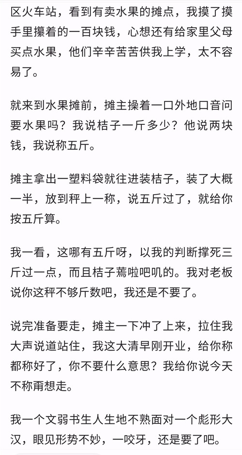 这天,二柱进城联系柑橘预售的事。刚下车就见一拨人在围观只听得圈内一个大嗓门正响得起劲:“现在虽说天下太平,但小小摸越来越多,拦路抢劫也不少见。