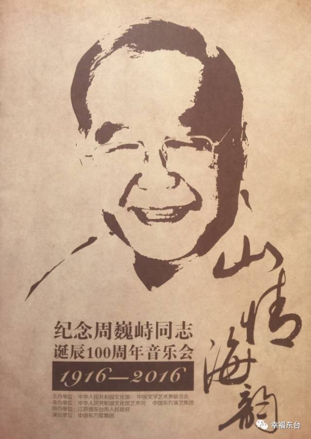 由国家文化部、中国文联主办,文化部艺术司、中国东方演艺集团承办,江苏省东台市人民政府协办,中国东方歌舞团演出的《山情海韵——纪念周巍峙同志诞辰100周年音乐会》,2016年12月21日晚在全国政协礼堂上演。音乐会深情唱响周巍峙同志创作的经典旋律,回顾并纪念老一辈艺术家为党和新中国革命文艺事业做出的不朽贡献,以此激励广大文艺工作者砥砺前行。详戳他是东台人!曾任国家文化部代部长!今年是他诞辰100周年,他的歌红遍全世界!