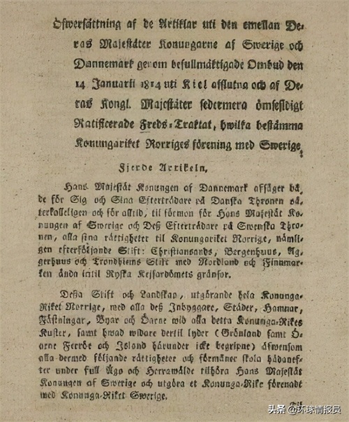 拿破仑战争后,站错队的丹麦受到了惩罚。1814年,丹瑞签订《基尔条约》,丹麦将挪威省割让给瑞典。