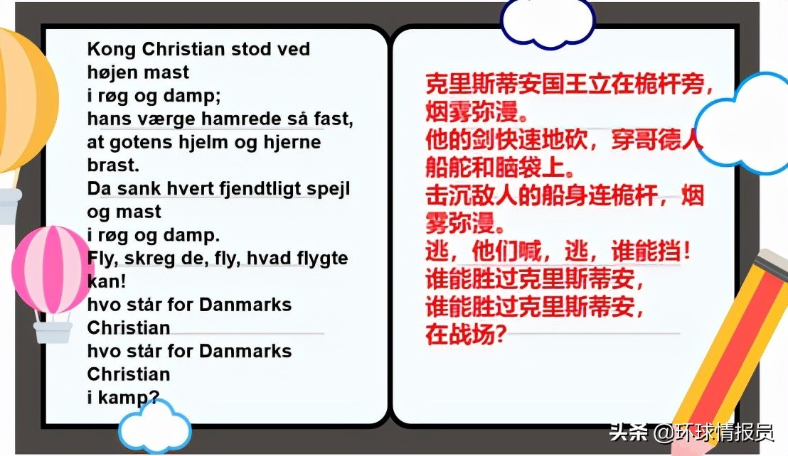 而且,丹麦两首国歌的风格截然不同,《有一处好地方》曲调柔和,歌词也体现了宛如“童话王国”般的情调;但《国王克里斯蒂安》的曲调昂扬向上,振奋人心,歌词似乎能展现出曾经维京海盗作战的勇敢场面。