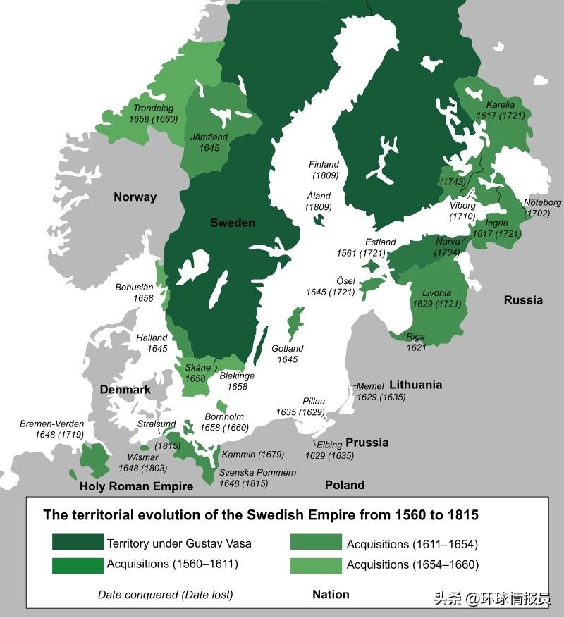 ▲1560年-1815年的瑞典领土变化,数字是获得年份,括号内数字是失去年份