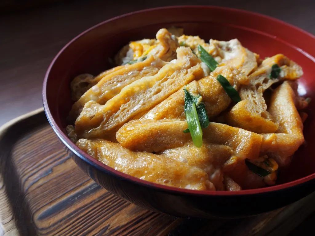「衣笠丼」是将油炸豆腐和葱用甜辣风的调味汁煮过后配蛋液加米饭制作而来,是发祥于京都的乡土料理,“衣笠”之名源自京都市北区的“衣笠山”。