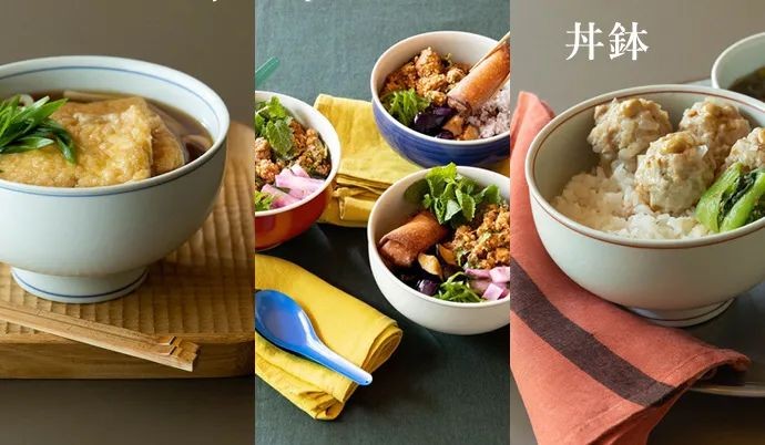 ① 作为「丼鉢」简称的「丼」是指盛装米饭、面类、汤等比饭碗大且深,质地较厚,通常为陶瓷制品(现在也有金属等其他材质)的大碗。这种大碗根据形状和用途还分为丸丼、平丼、玉丼、高台丼、切立丼、面丼、饭丼、多用丼等很多种类。