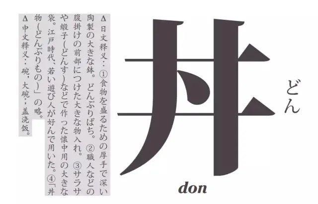 另外值得一提的是,在日语中「どんぶり」之所以会使用「丼」这个汉字,是因为其既可形声,也可会意。一方面,「丼」这个字看起来像是往井中投了东西,在日语中重物落水所用的拟声词有「どぶん,dobun」或「どぼん,dobon」,发音与「どんぶり」很像;另一方面,「丼物,どんぶりもの」中用「丼」也被认为能体现出不断将米饭放入深碗之中的意象,于是就被沿用了下来。