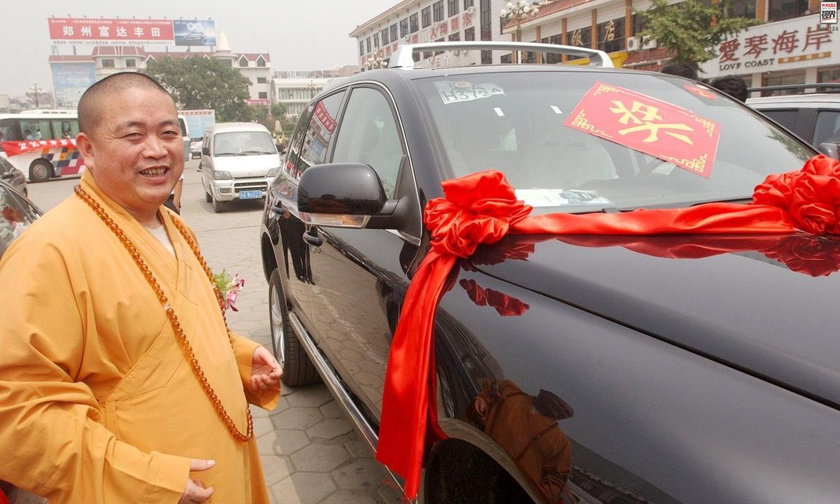 释永信统管少林寺的的商业事宜,平日里手拿苹果手机,出行坐豪车,身后还带着一群和尚。