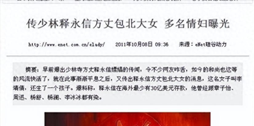 私生活混乱更是无稽之谈,网上爆料的情妇是释永信的侄女刘梦亚,所谓私生子是他收养的弃婴。