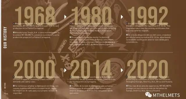 1968年,MTHELMETS品牌建立,开始了在西班牙拉帕尔马卡塔赫纳 (La Palma Cartagena)的生产的道路