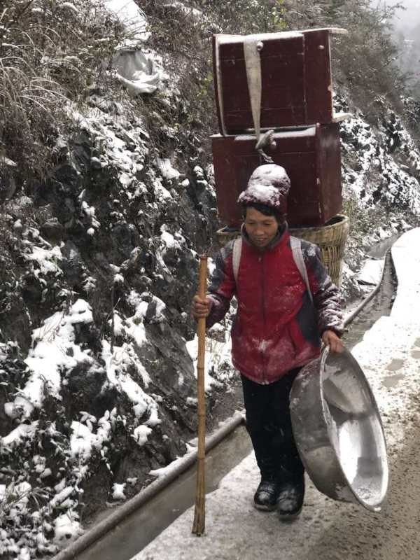 发完这条朋友圈,当天下午,焦波在小区碰到一位农妇。从照片上看,农妇已经在雪地里走了一段时间,帽子上,背篓里的东西上,都是积雪,因为要提着一个大号洗衣盆,自然弯曲的手臂上,也都是雪。背篓里是水桶和两个木柜子样的东西,摞了足有一人多高。