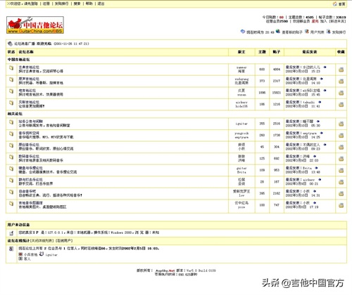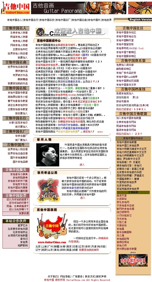 2000年10月1日正式开通,网站刚开始全部是Htm页面,几乎没有任何程序(我也不会程序,到现在也不会,对于电脑软件,我不喜欢的1个是编程,1个是3D,其他都可以玩的过去,并因此做过10多个工种),我一页一页做,一个连接一个连接做,大概做了几百页吧(现在上万页了吧)。网站刚推出时,很难看,或许就象一个婴儿诞生一样。但,它出生了。那时目标很明确,我清楚的记得吉他中国第1条新闻是:吉他中国要做中国最好的吉他音乐交流社区、做商业的网站(当时还被人怼~)。我从未反对商业,在这个CAO蛋的时代,人都在追寻物质的或精神的,这无可厚非,而且取之有道。