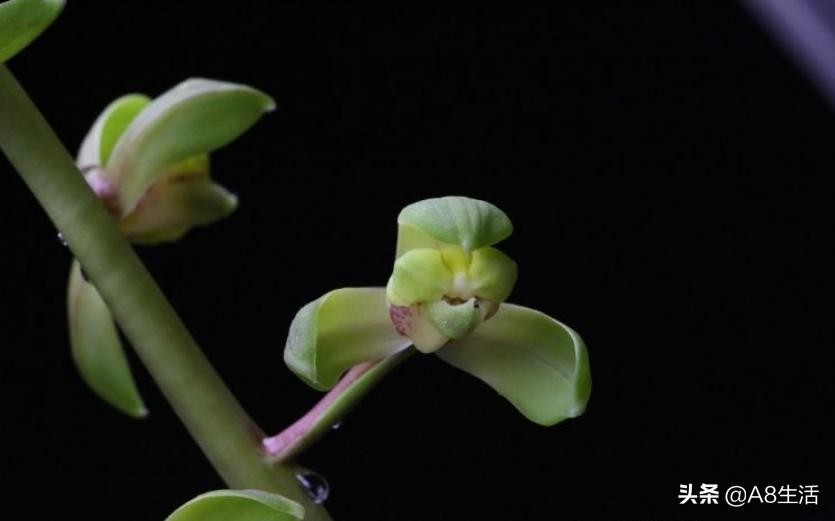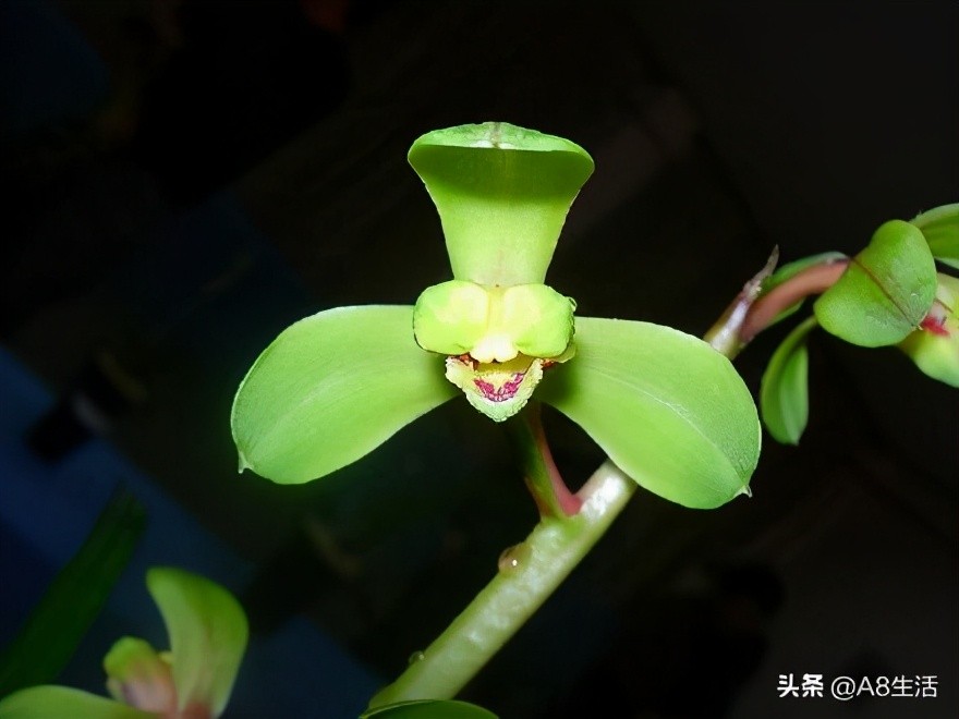 花梗粗,俗称木梗,花梗高出叶架,花柄紫红色,花梗绿底有红云。一杆着花通常7-9朵,外三瓣圆整紧边,花瓣质厚,花色赤转绿,瓣根有粉红云,俏丽异常,花瓣短圆阔大而光洁,捧瓣分头合背为半硬蚕蛾捧,尖如意仰舌。壮株开花捧瓣分窠,舌瓣也能略放宕,绿苔舌上有紫红点。