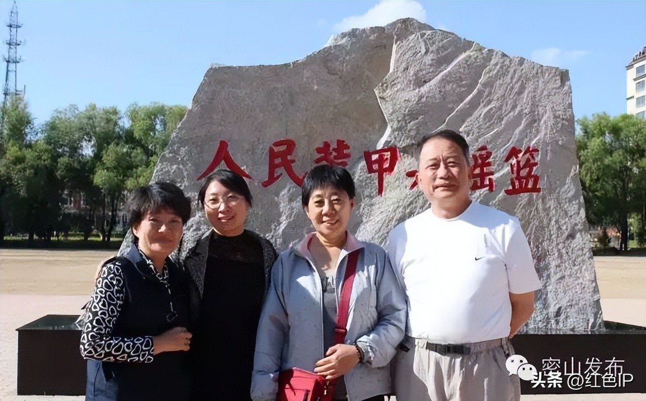 傅明毅(右二)、傅明琪(左一)和盛晓鹰(右一)、傅胜瑛(左二)在密山市第三中学合影留念