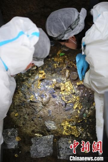 三星堆遗址 5 号祭祀坑黄金大面具发掘现场。雷雨 摄