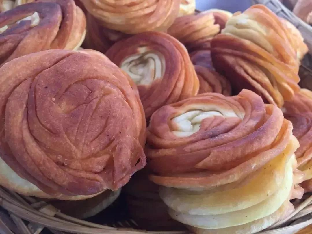油旋饼、甜锅盔,一定要趁热吃,热的时候甜锅盔外皮焦脆,内软香糯,反复咀嚼回味清甜,油旋饼则入口香脆,带着微微的麻味,咬一口就能从唇齿酥到心里。