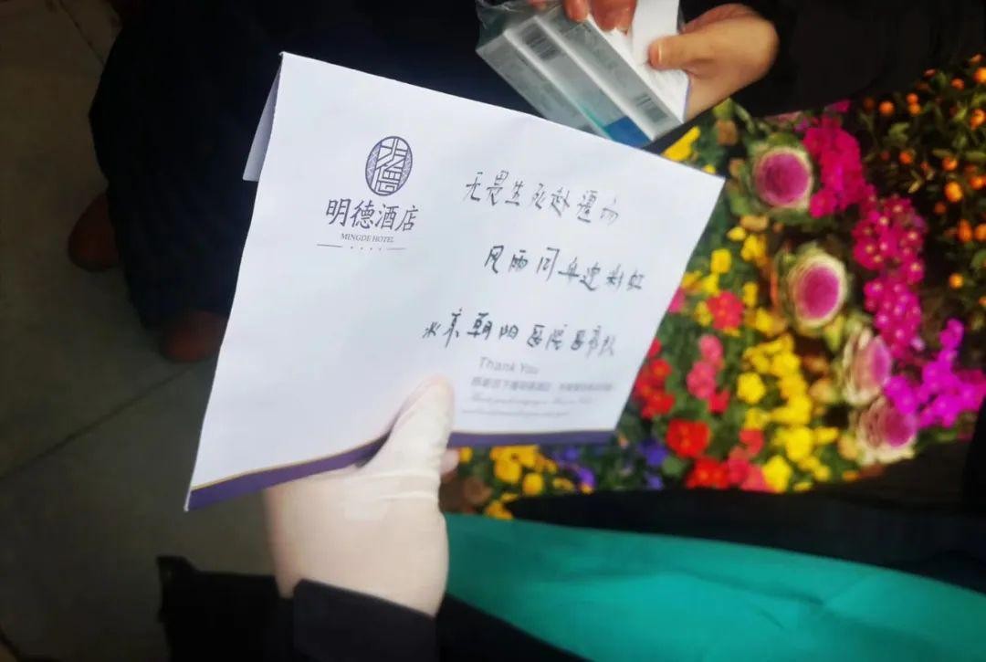 今天痊愈出院的患者中有一位外地商人,唐子人清楚地记得十几天前他入院时伴有高热和喘憋。这位商人在武汉做生意,有两个孩子,一个12岁,一个6岁。唐子人经常鼓励他说:相信你一定能走出去,和孩子团聚!出院那天,唐子人和同事们把2003年为抗击非典创作的歌曲《手牵手》的歌词抄录下来,签上名字,制作成贺卡送给这位商人。