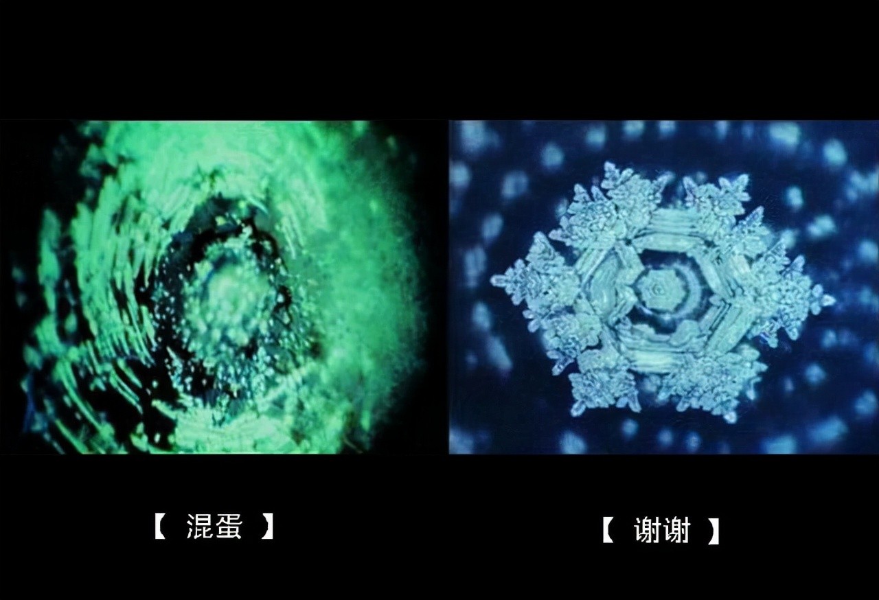 接下来就更有趣了。他认为水既然如此厉害,搞不好连字都看得懂。所以他在白纸上写下「谢谢」、「混蛋」等字眼,然后贴在水瓶上。结论是“水也能看得懂”!看到像是「谢谢」、「爱和感谢」这些字,水会呈现和听过巴哈音乐类似的优美结晶。如果贴的是一些坏话,好比是「混蛋」、「烦死了杀死你」这种骂人的字眼,水就会呈现丑陋零散的样子。看到写着「鬼魂」的字卡,水也会跟着闹鬼,出现灵魂飘渺的形状(如果写上科学水会是什么样子呢?)。而且水还能看懂多国语言喔,用英文和韩文写的字,也跟日文的同义字有类似的反应。所以各位望子成龙的家长们,不必着急地花大钱帮小孩找英文家教,只要让他们多喝水就行了,因为水不但情感丰富、是非分明,还具有多国语文能力,实在是最完美的家庭教师。