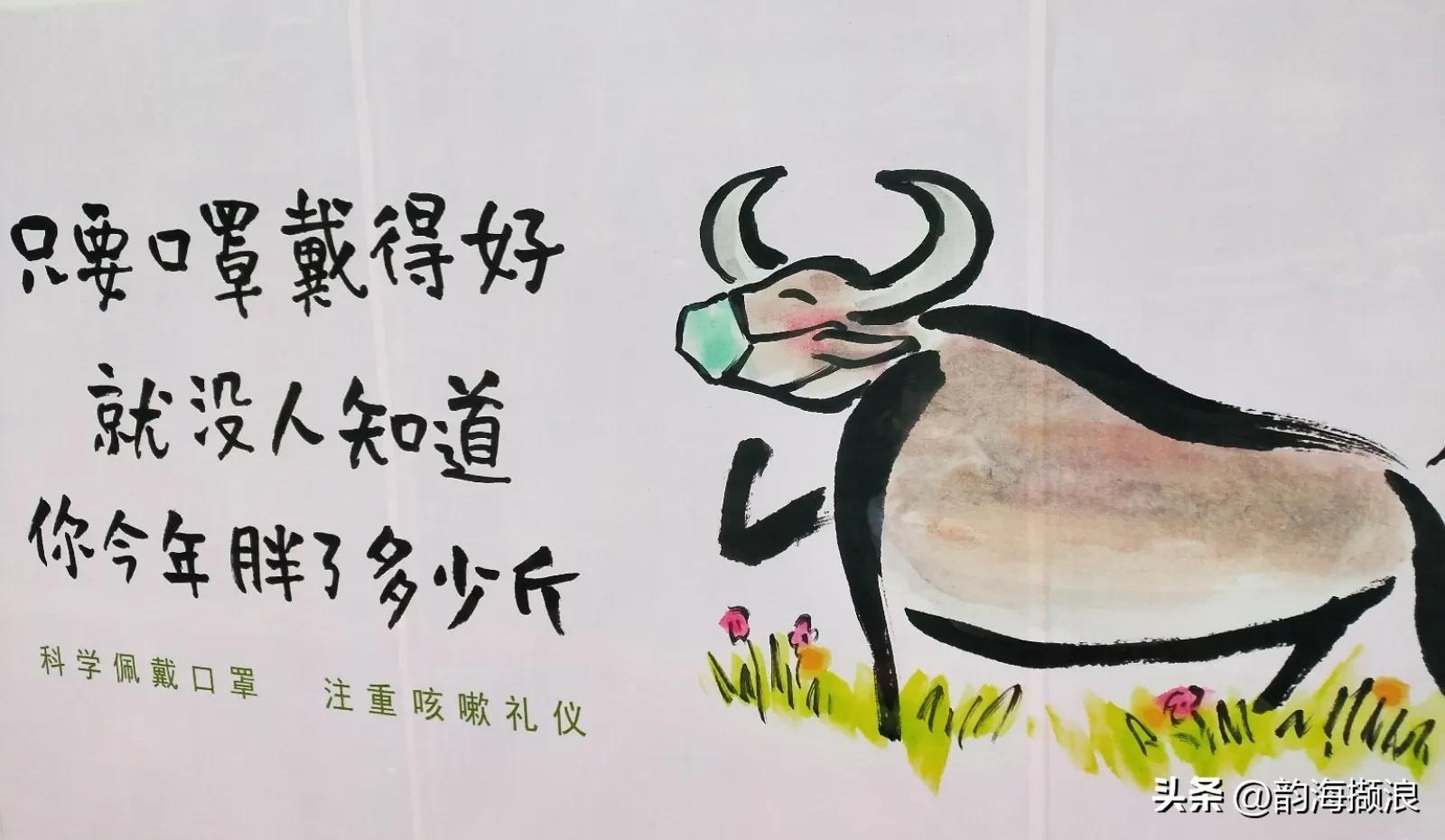 第三幅画画得很幽默。一头水牛得意洋洋地说:“只要口罩戴得好,就没人知道你胖了多少斤。”只是,这头牛因为三戴有口罩的,我们也就无法得知它有没有鼻子。嘿嘿。