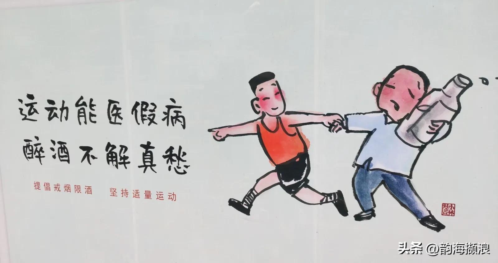 第二幅画,是宣传戒酒与运动的。这话说得也好”运动能医假病,醉酒不解真愁。”事实是这样的。不是有这样一句话吗:“借酒浇愁愁更愁。”古希腊人曾在山壁上刻下过一行字:“你想健康吗?跑步去吧!你想美丽吗?跑步去吧!你想聪明吗?跑步去吧!”