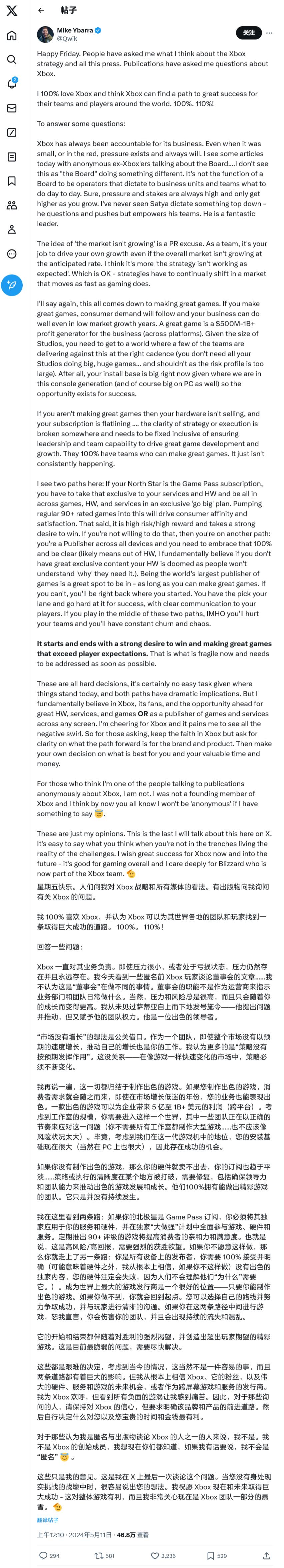 IT 之家 5 月 12 日消息,近日,前暴雪总裁 Mike Ybarra 在自己的 X(推特)账号发长文,敦促 Xbox 应当将工作的重心重新转移到制作优秀的游戏上来。