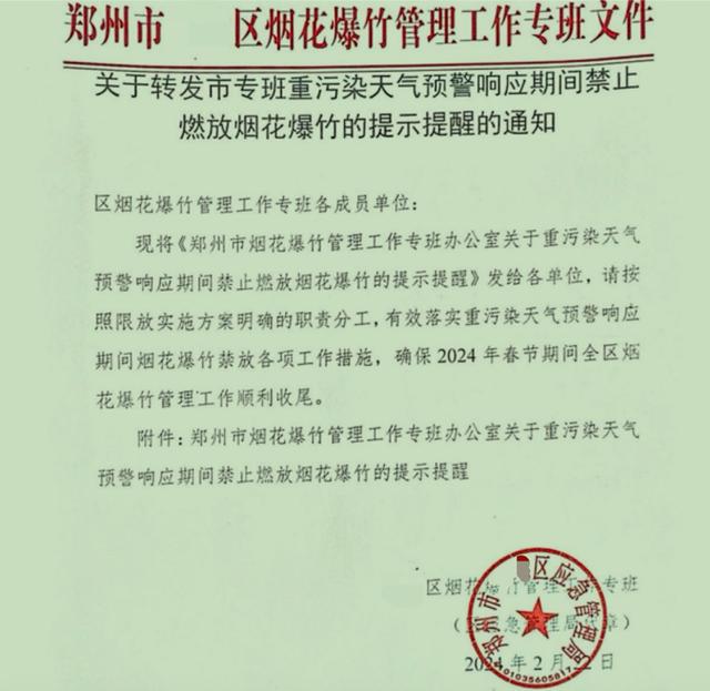 某区一份《烟花爆竹管理工作专班文件》显示," 现将《郑州市烟花爆竹管理工作专班办公室关于重污染天气预警响应期问禁止燃放烟花爆竹的提示提醒》发给各单位,请按照限放实施方案明确的职责分工,有效落实重污染天气预警响应期问烟花爆竹禁放各项工作措施,确保 2024 年春节期问全区烟花爆竹管理工作顺利收尾。"