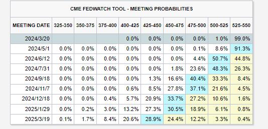 CME 美联储观察工具(FedWatch)周一显示,市场对 6 月份降息 25 个基点的预期一度降至 50% 以下。