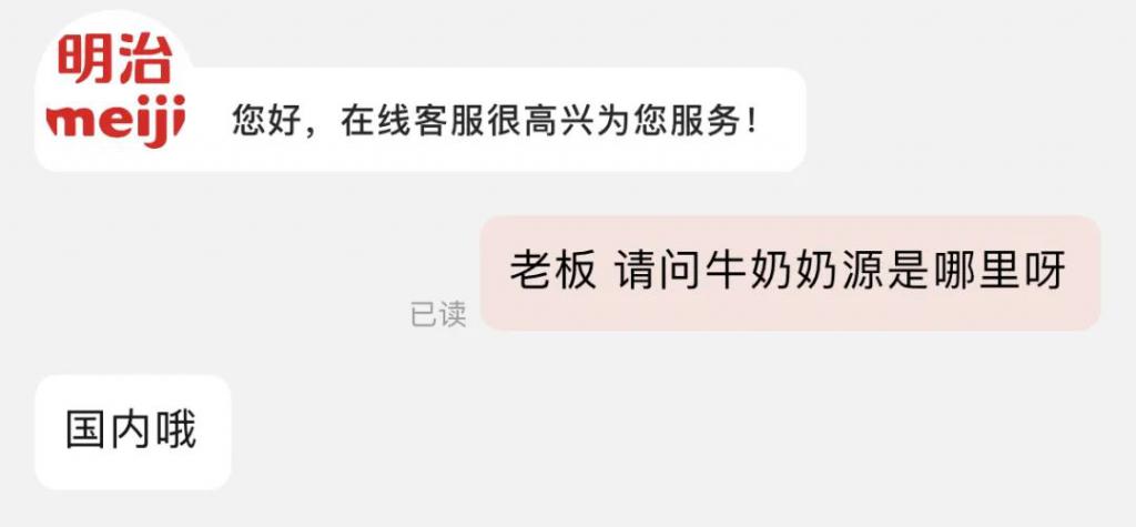 在国内,两家电商平台的明治网店客服表示,明治为日本品牌,但其售卖产品均为国内奶源。
