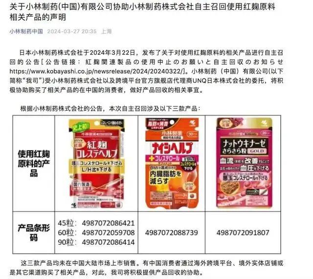 据悉,小林制药已宣布召回所有 3 款含红曲成分保健品(红曲胆固醇颗粒、纳豆激酶颗粒、降胆固醇健康辅助颗粒),并呼吁消费者停止使用相关产品。这 3 款产品并未在中国大陆上市。不过,小林制药表示,对通过跨境平台、境外实体店铺或是其它渠道购买了相关产品的中国消费者,小林制药将提供产品回收协助。