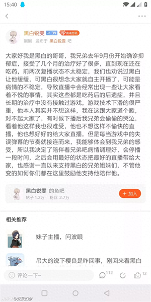 可是没想到最近黑白传来了不太好的消息,一位自称是黑白哥哥的网友终于是在DY贴吧中发了一个帖子,里面的具体内容就是说道了黑白已经确诊患上了抑郁症,在去年9月份确诊的。