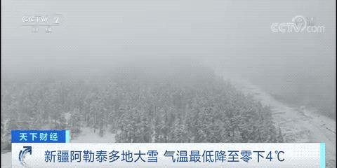 除了青河县,富蕴县可可托海景区也出现了降雪天气,纷纷扬扬的大雪从昨天(20 日)凌晨 4 点开始,下了 8 个多小时,降雪给原本绿色的山林披上了一层银装。