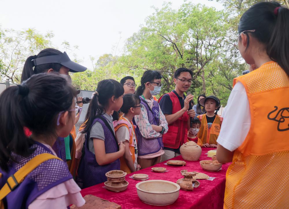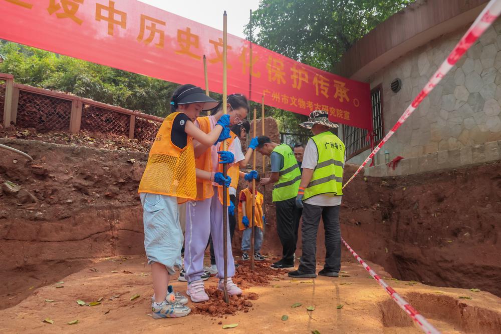 体验使用洛阳铲、通过刮面寻找遗迹、近距离观摩出土文物…… 4 月 13 日,广州动物园大熊猫新馆的考古工地热闹无比,近 20 名中小学生化身小小体验官,走进千年古墓群实地探秘。