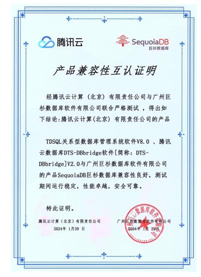 3 月 26 日,腾讯云对外透露,旗下关系型数据库管理系统软件 TDSQL 、数据库迁移平台 DTS-DBbridge 已与巨杉数据库 SequoiaDB 完成产品兼容性认证。测试结果表明,通过 DTS-DBbridge 可以将巨杉数据库的常规表、分区表、主子表等表库的数据顺利迁移到 TDSQL,数据同步到 TDSQL 后兼容性良好,数据一致性校验符合预期,整体业务运行稳定,安全可靠。