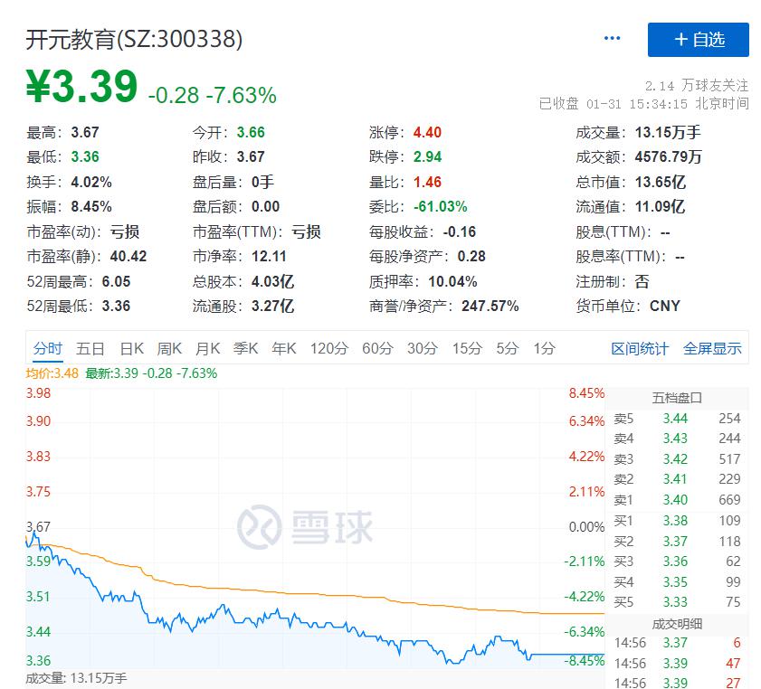 业绩预告发出后,截至 1 月 31 日,开元教育股价跌至 3.39 元 / 股,大跌 7.63%,创造了 52 周新低。