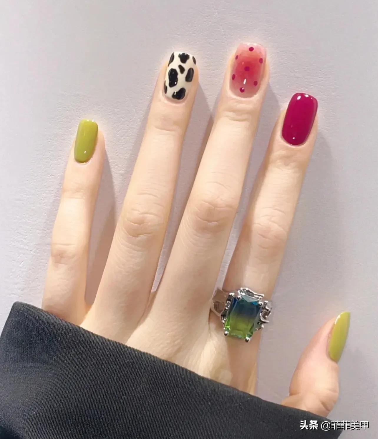 3,枚红色系的美甲气质绝佳,大拇指和小女子搭配绿色,中指腮红甲搭配波点,无名指做牛纹,整个感觉时尚大方!