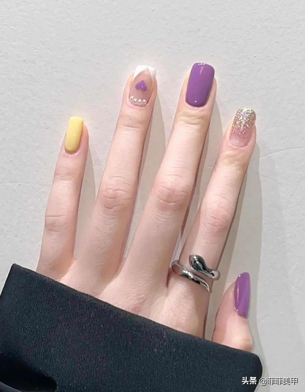 2紫色系的美甲,香芋紫主打,食指搭配爆闪系列,小拇指用乳白色中和!整只手都温和了不少,无名指搭配法式边边,再配上珍珠 ,两个字:好看